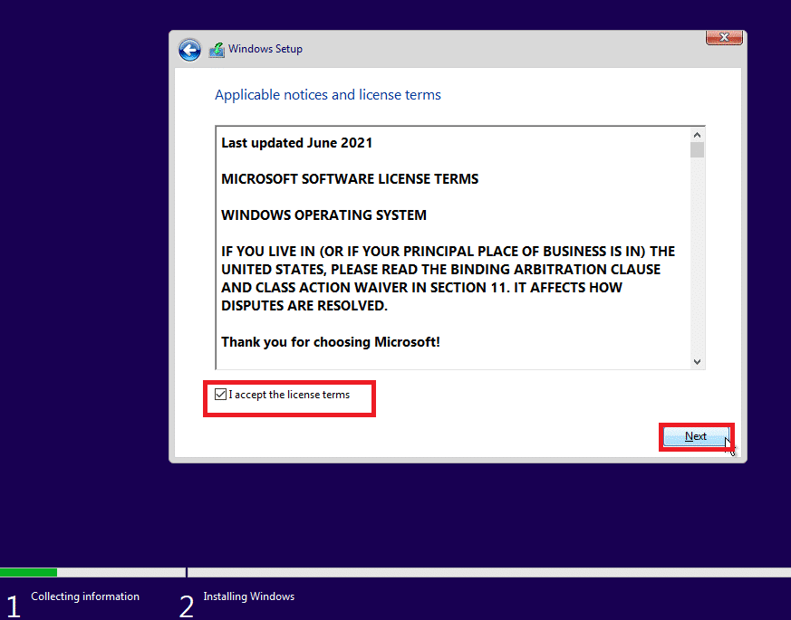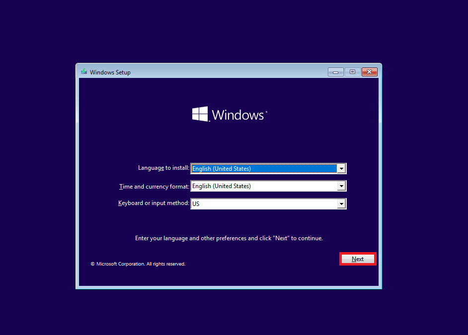 The Windows 10 setup and installation window shall launch, choose “country and language” and hit “next”.