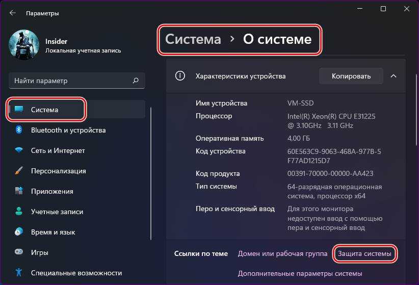 Для активации функции защиты системы, обеспечивающей работу точек восстановления, в Windows 11 отправляемся в системное приложение «Параметры». Идём по пути «Система > О системе». В блоке «Ссылки по теме» кликаем «Защита системы». Это ссылка запуска окошка свойств системы в классическом формате.