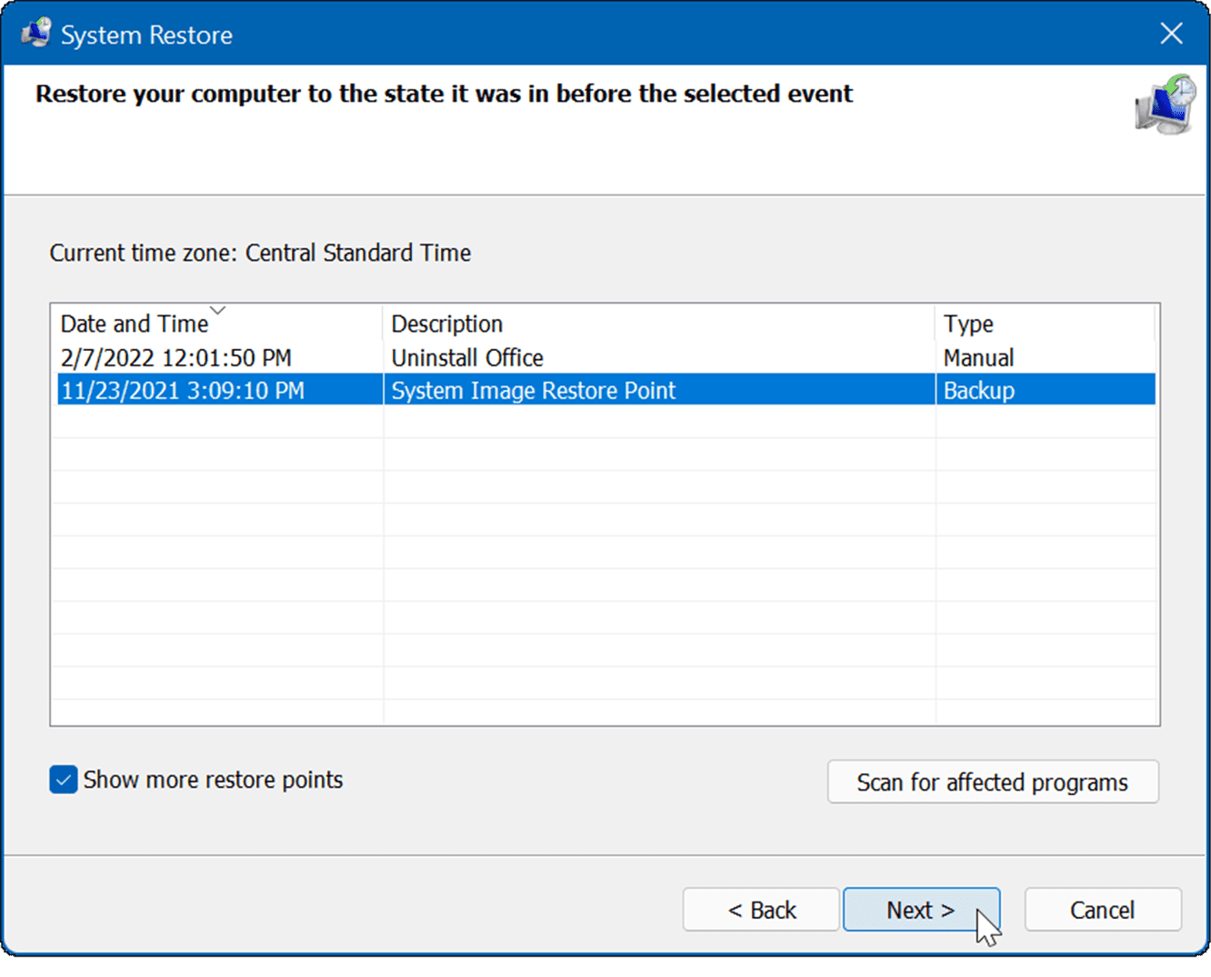 - На следующем экране выберите точку восстановления, которую хотите использовать. Чтобы увидеть больше, проверьте Показать больше точек восстановления вариант слева. При желании вы можете нажать кнопку Сканировать уязвимые программы кнопку для просмотра приложений, которые будут удалены в процессе восстановления.