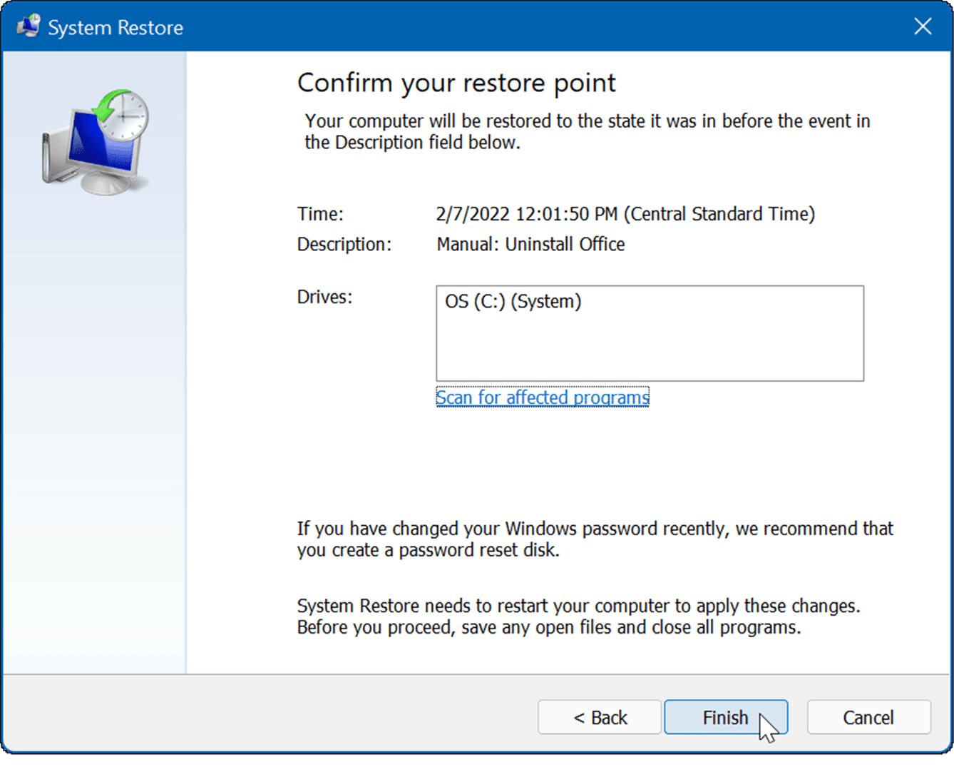 - Подтвердите точку восстановления и нажмите кнопку Заканчивать кнопка. Если выбранная вами точка восстановления выглядит неправильно, вы все равно можете щелкнуть значок Назад кнопку и изменить его.
