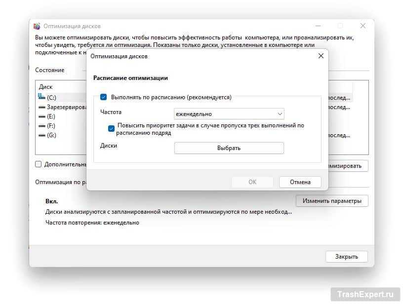Чтобы изменить частоту запуска процедуры оптимизации, под заголовком «Оптимизация по расписанию» нажмите на кнопку «Изменить параметры». Можно заставлять проверку запускаться ежедневно, еженедельно и ежемесячно.