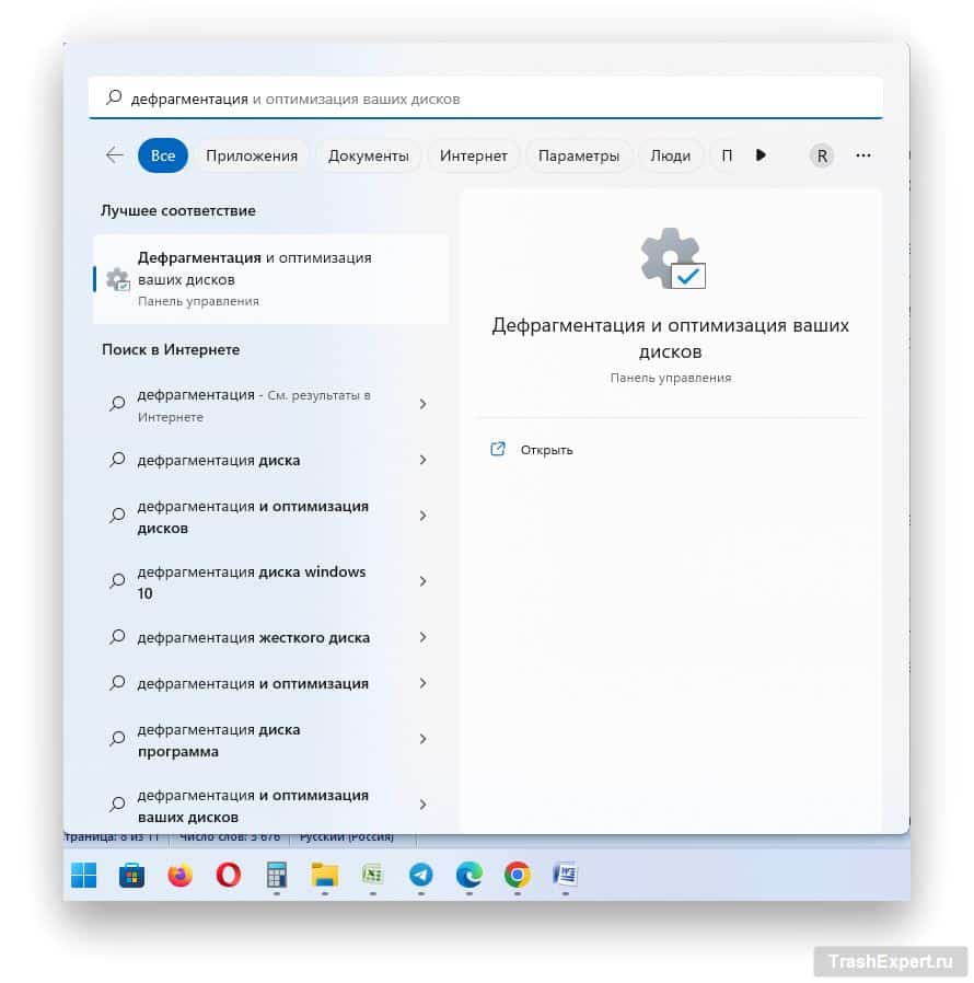 Оптимизация жёстких дисков и твердотельных накопителей в системах Windows 10 и Windows 11 выполняется автоматически. Компьютер сам запускает дефрагментацию или TRIM. Если вы хотите убедиться, что всё сделано как положено, можно запустить процесс вручную или поменять расписание автоматического запуска. Нажмите на кнопку «Пуск» и введите в поиск «дефрагментация». Нажмите на результат «Дефрагментация и оптимизация ваших дисков».