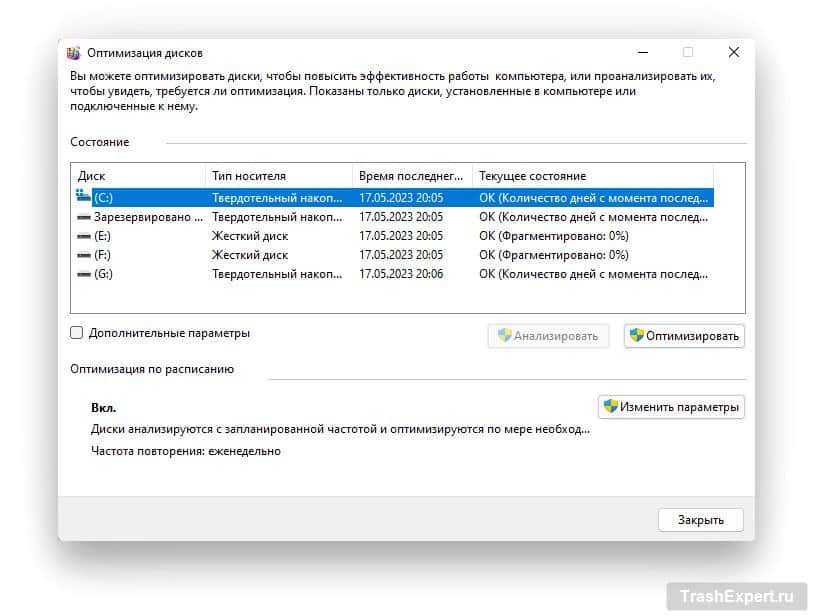 Если всё нормально, в этом столбце написано ОK. У жёстких дисков написано также «Фрагментировано: 0%». У твердотельных накопителей указана дата, когда в последний раз запускалась команда TRIM. По умолчанию оптимизация производится еженедельно, но если окажется, что процесс не запускался уже давно, выберите диск и нажмите на кнопку «Оптимизировать».