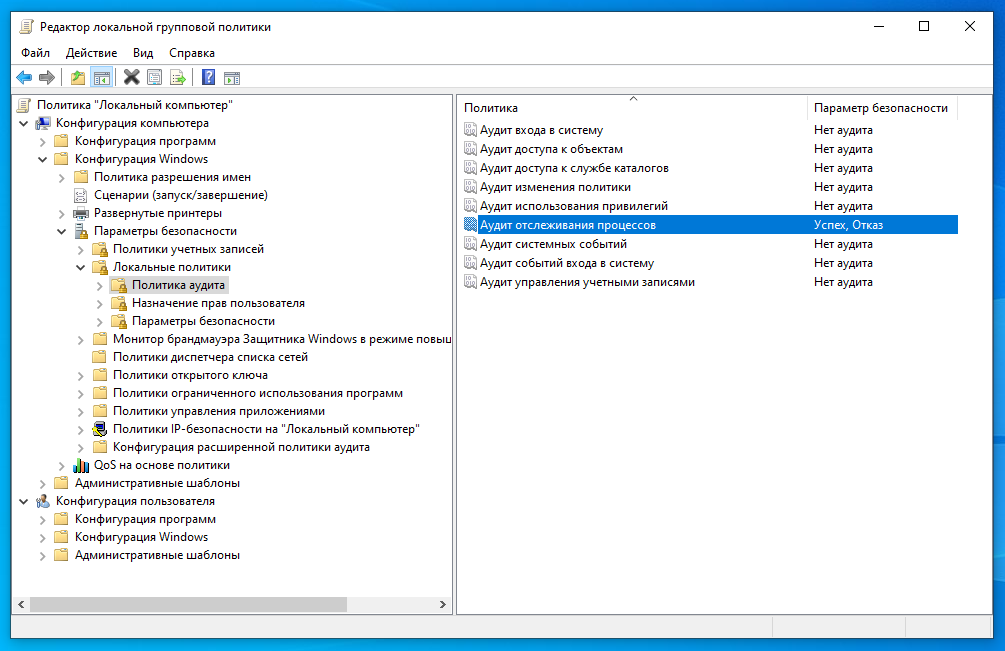В русскоязычной версии это соответственно: Конфигурации компьютера → Конфигурация Windows → Параметры безопасности → Локальные политики → Политика аудита: