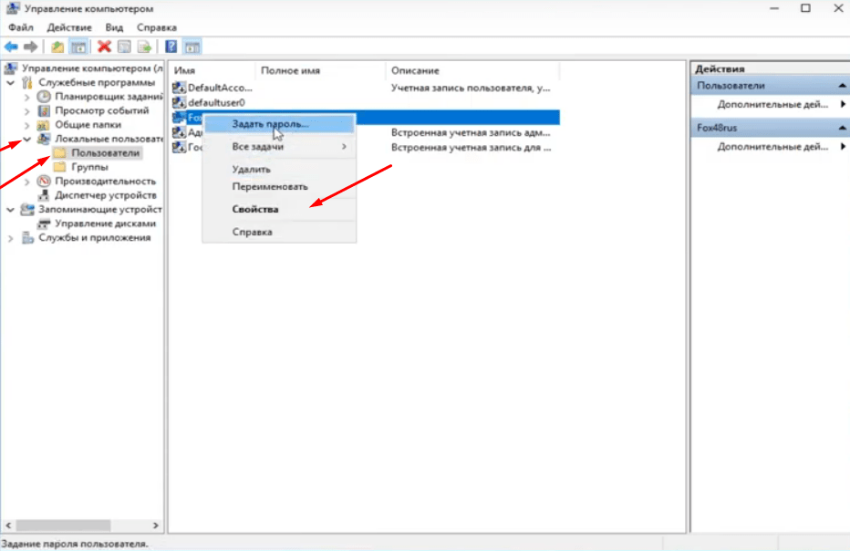 Открываем «Локальные пользователи», затем «Пользователи», выбираем свою учетную запись и жмем по ней правой кнопкой мыши для вызова контекстного меню. Кстати, тут тоже можно задать пароль. Кликаем по элементу «Свойства» в самом конце списка.