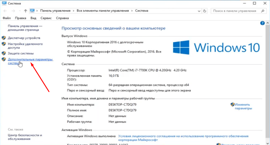 В новом окне ищем ссылку «Дополнительные параметры системы» и жмем по ней.