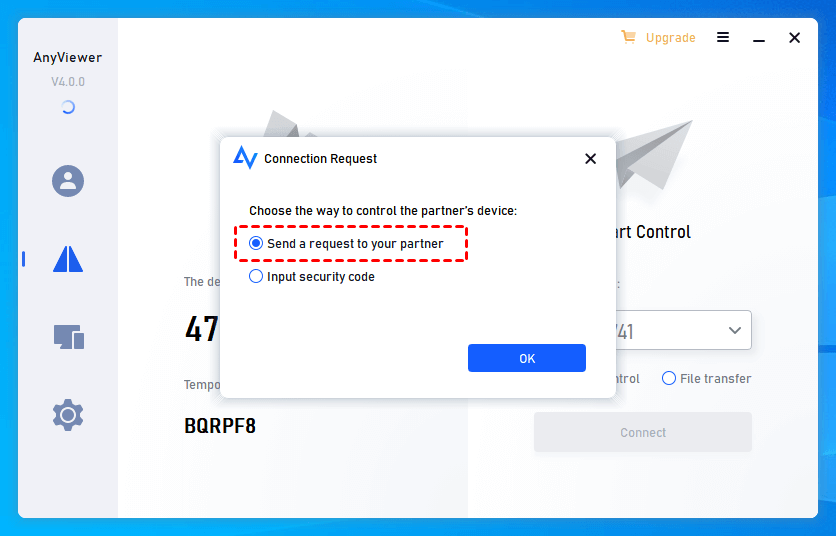 Step 5. For the 2 options, choose the first one “Send a control request to your partner”, and then click on “OK”.