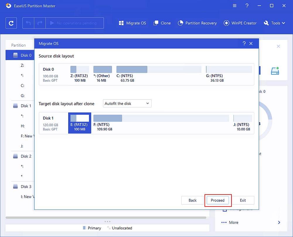 Шаг 3: предварительно просмотрите, как будет размечен указанный диск. Вы также можете изменить текущие установки, чтобы настроить разметку диска по своему усмотрению. Затем нажмите «Продолжить», чтобы начать перенос вашей ОС на новый диск.