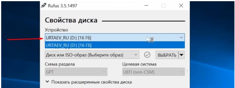 - Выберите подходящий USB-накопитель в разделе «Device».