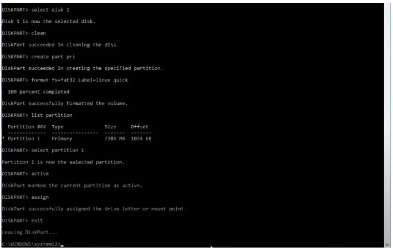 select disk 1cleancreate partition primaryformat fs=fat32 quickactiveassignlist volumeexit