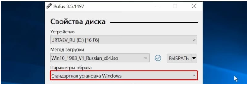 В графе «Параметры образа» оставляем «Стандартная установка Windows» (здесь имеется возможность также создания носителя Windows To Go, с него выполняется запуск ОС без её инсталляции).
