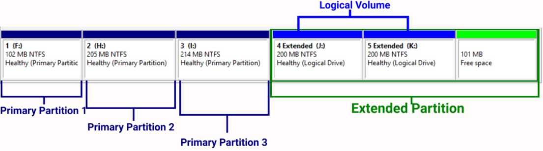 Структура MBR на примере накопителя с 3 основными разделами и 1 расширенным, разбитым на 2 логических диска
