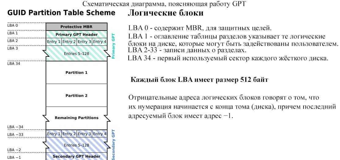 - На диске должно быть свободное место для размещения основной и дополнительной таблицы GPT в начале и конце диска