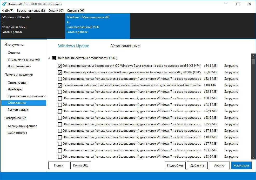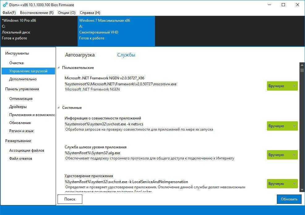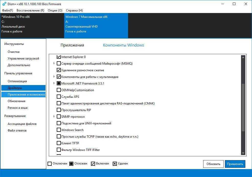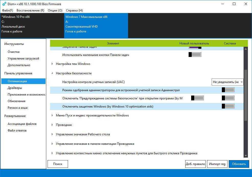 С их помощью вы можете отключить в сборке ненужные службы и компоненты, настроить рабочий стол и контекстное меню, применить твики реестра, удалить ненужные интегрированные драйвера и обновления. Возможна также установка обновлений из локальных файлов или интернета