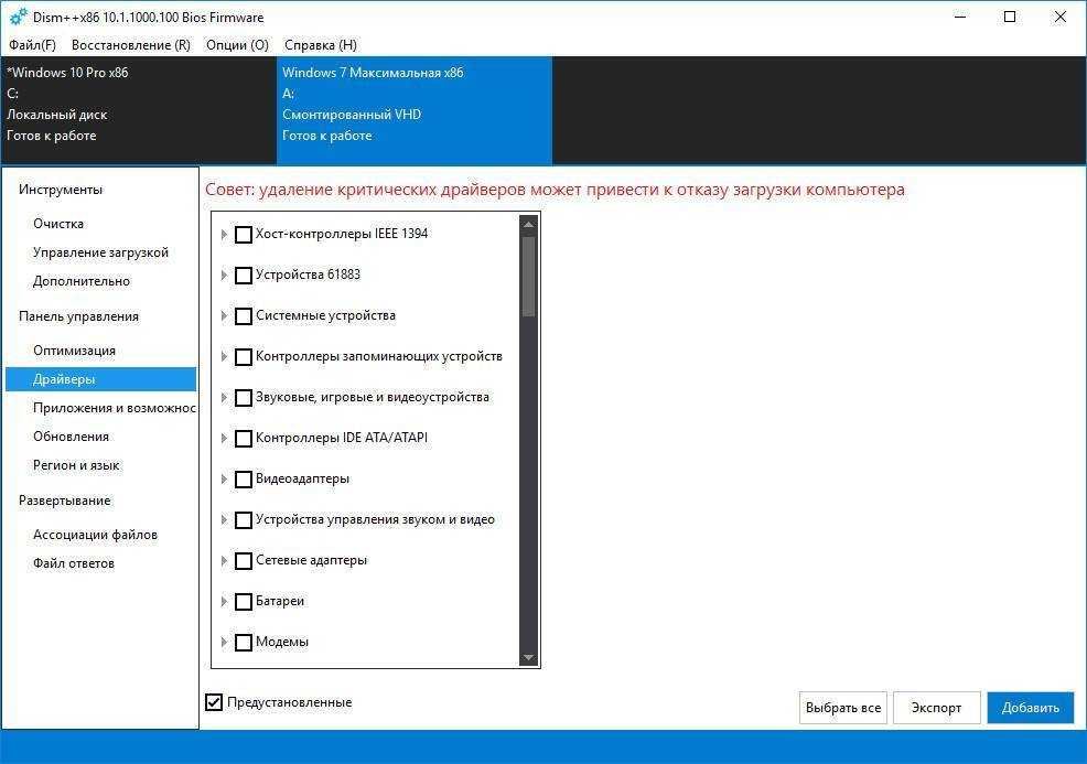 Будьте внимательны на этом этапе настройки, удаляйте только те компоненты и службы, назначение которых вам хорошо известно. Особенно это касается драйверов, если вы по ошибке удалите важный драйвер, сборка не сможет установиться.