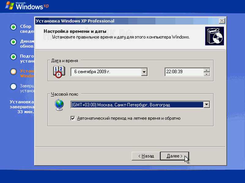 Ввести дату, часовой пояс. Во всех окнах мы нажимаем кнопку «Далее».