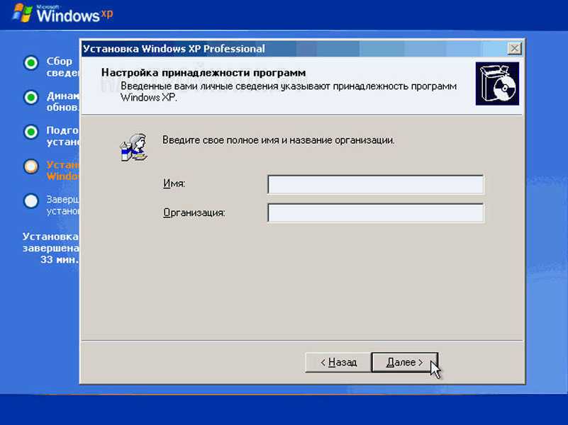 Здесь нам предлагается ввести собственное имя и наименование организации. Вводим абсолютно любые данные и жмем «Далее».