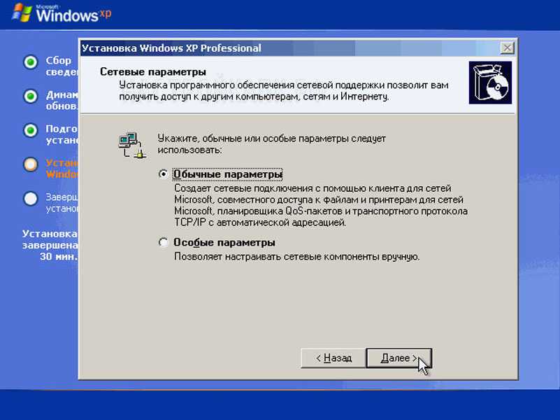После этого переходим в окно «Настройка параметров сети». Лучше всего на данном этапе пропустить настройку локальной сети и выполнить ее позже, по окончании установки. Для этого выбираем пункт «Обычные параметры» жмем кнопку «Далее».
