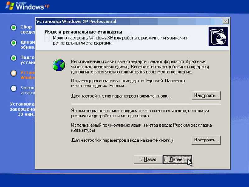В процессе у нас будут появляться некоторые окна. Через кнопку «Настроить» можно изменить язык клавиатуры по умолчанию и региональные стандарты.
