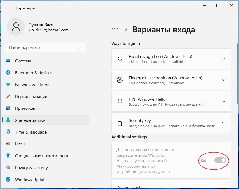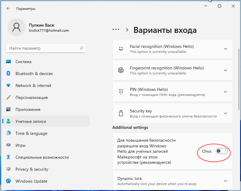 Сначала в блоке «Дополнительные параметры» нужно отключить опцию «Для повышения безопасности включите вход Windows Hello для учетных записей Майкрософт».