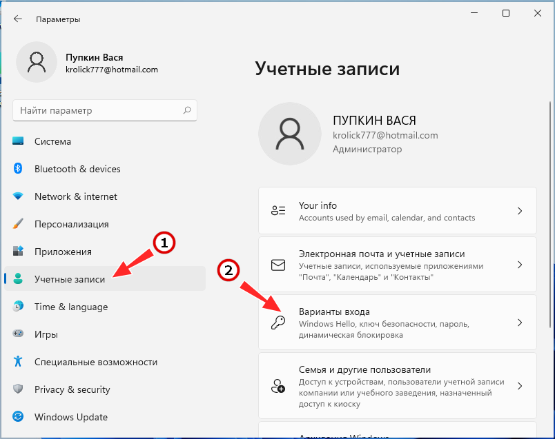 4. Переходим «Учетные записи -> Варианты входа».