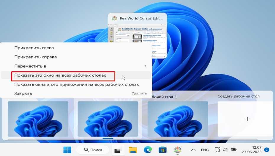 - Показать окна этого приложения на всех рабочих столах — здесь имеется в виду, что если программа может иметь несколько окон (например, Word или Google Chrome), то все окна этой программы будут отображаться на всех рабочих столах.