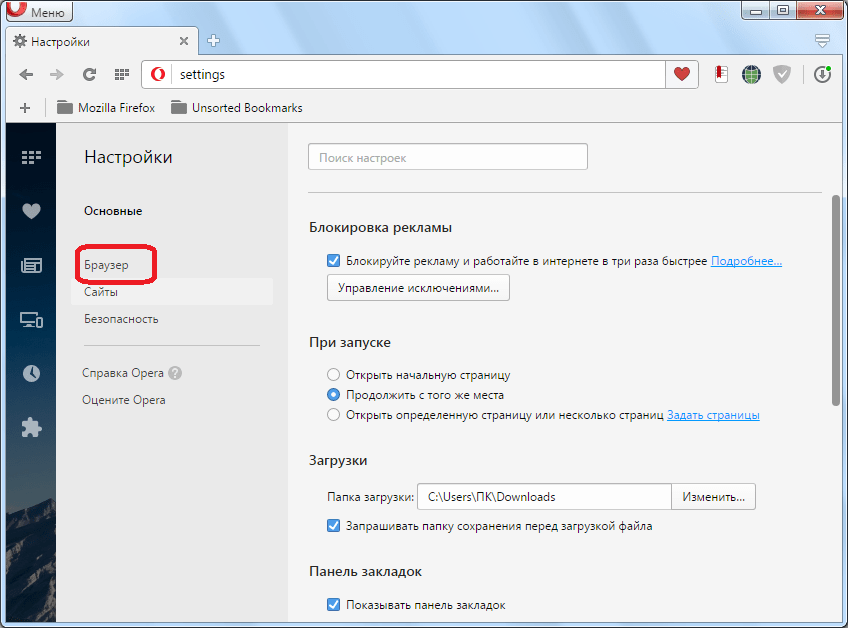 В открывшемся окне настроек, переходим в подраздел «Браузер».