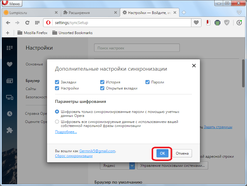В открывшемся окне, устанавливая галочки над определенными пунктами, можно определять какие именно данные будут синхронизироваться: закладки, открытые вкладки, настройки, пароли, история. По умолчанию, синхронизируются все эти данные, но пользователь может отключить синхронизацию любого элемента отдельно. Кроме того, тут же можно выбрать уровень шифрования: шифровать только пароли к сайтам, или все данные. По умолчанию выставлен первый вариант. Когда все настройки выполнены, жмем на кнопку «OK».