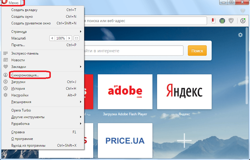 Теперь, давайте выясним, как войти в учетную запись синхронизации, если она уже у пользователя имеется, чтобы синхронизировать данные Оперы с другого устройства. Как и в предыдущий раз, заходим в главное меню браузера в раздел «Синхронизация…». Но теперь, в появившемся окне, жмем на кнопку «Войти».