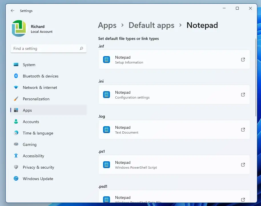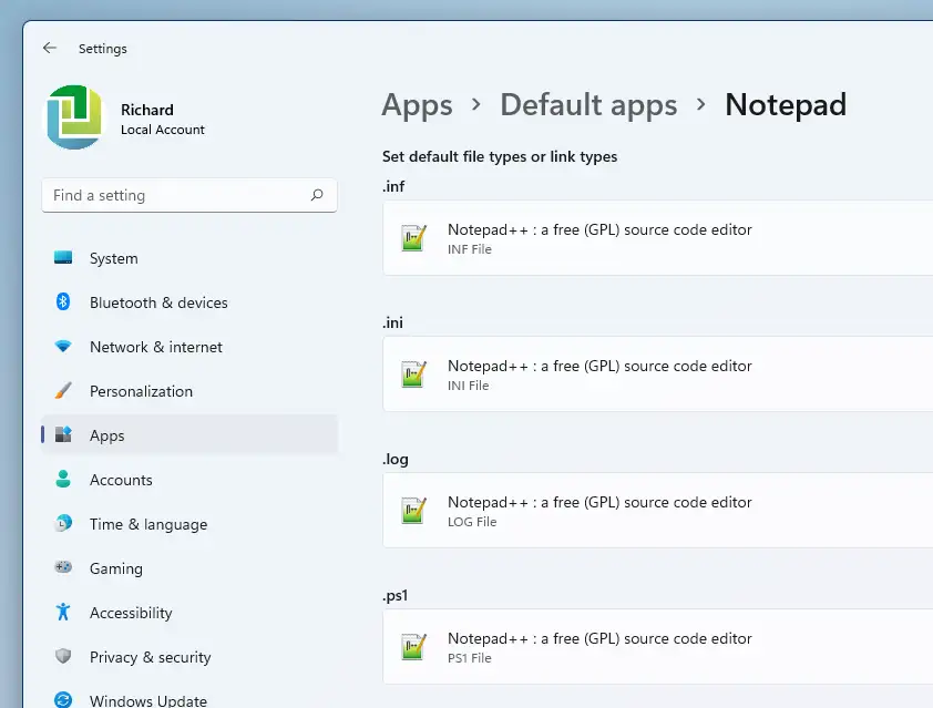 На следующей странице будет отображен список всех типов файлов и типов файлов по умолчанию, которые Блокнотявляется файлом по умолчанию для. Просто выберите каждый тип и переключитесь с Блокнотإلى Notepad ++.