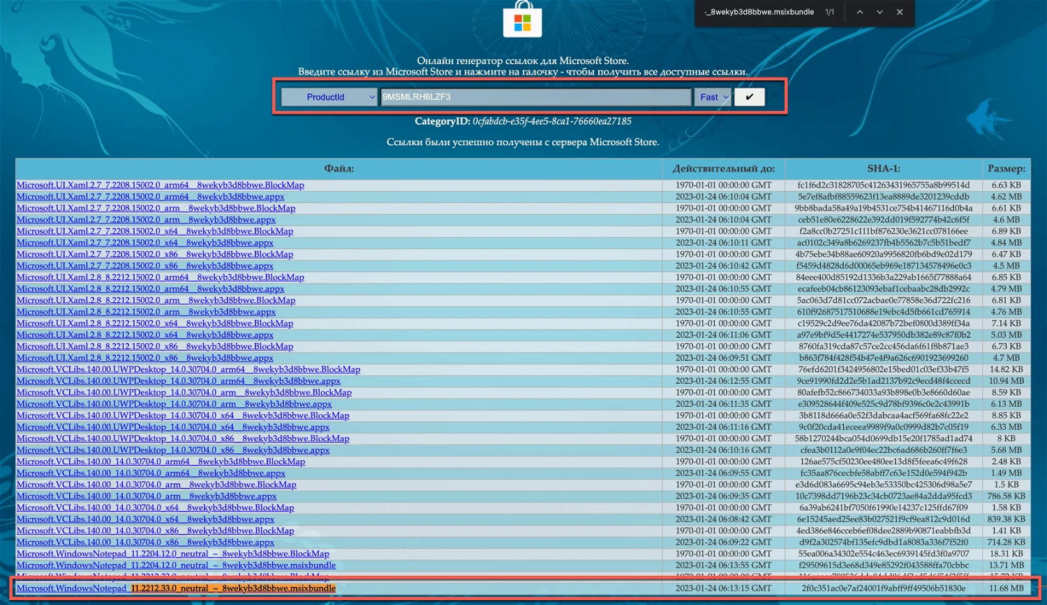 Подождите, пока будут сгенерированы ссылки. Прокрутите вниз до конца страницы. Нас интересует установщик с именем Microsoft.WindowsNotepad_11.2212.33.0_neutral_