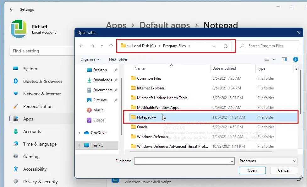 По умолчанию он откроет каталог C:\Программные файлы . Откройте папку Notepad ++ и выберитеПриложение Notepad ++