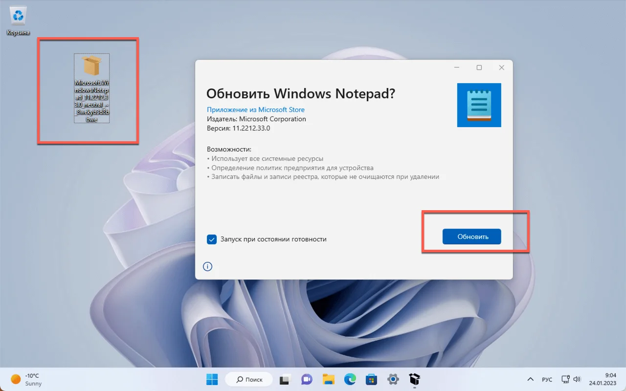 При запуске файла, Windows спросит, хотите ли вы обновить текущую версию Блокнота. Нажмите кнопку Обновить, чтобы продолжить установку. Для установки необходима программа Установщик приложения из Microsoft Store.