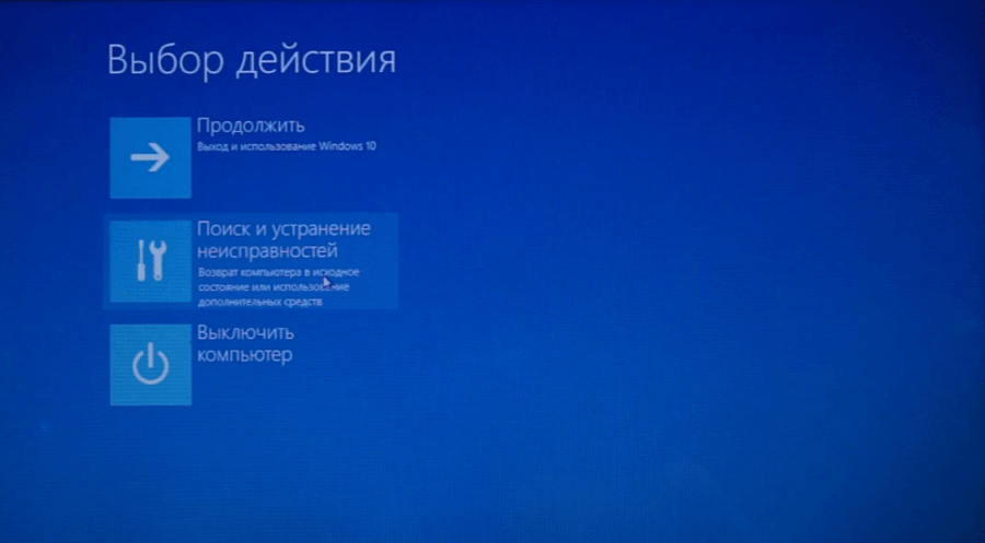 После перезагрузки ПК, откроется среда восстановления Windows RE, в которой нужно выбрать вариант «Поиск и устранение неисправностей».