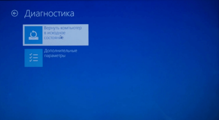 В окне «Диагностика» выберите параметр «Вернуть компьютер в исходное состояние».