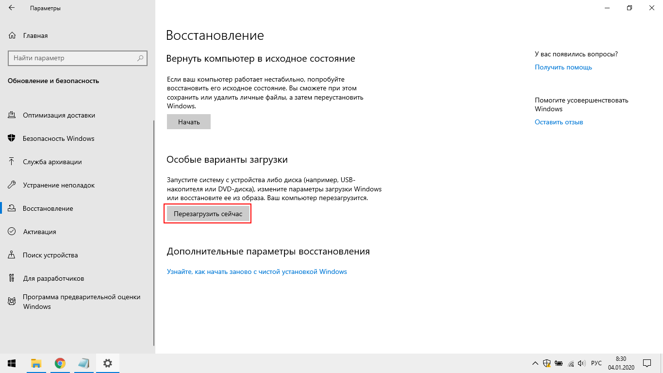 Войдите в раздел «Восстановление», в настройке «Особые варианты загрузки» нажмите на кнопку «Перезагрузить сейчас».