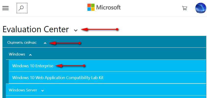 Чтобы получить доступ к загрузке этого оценочного ПО, необходимо на сайте залогиниться с использованием учётной записи Майкрософт. Логинимся, выбираем раздел «Оценить сейчас» и – «Windows 10 Enterprise».
