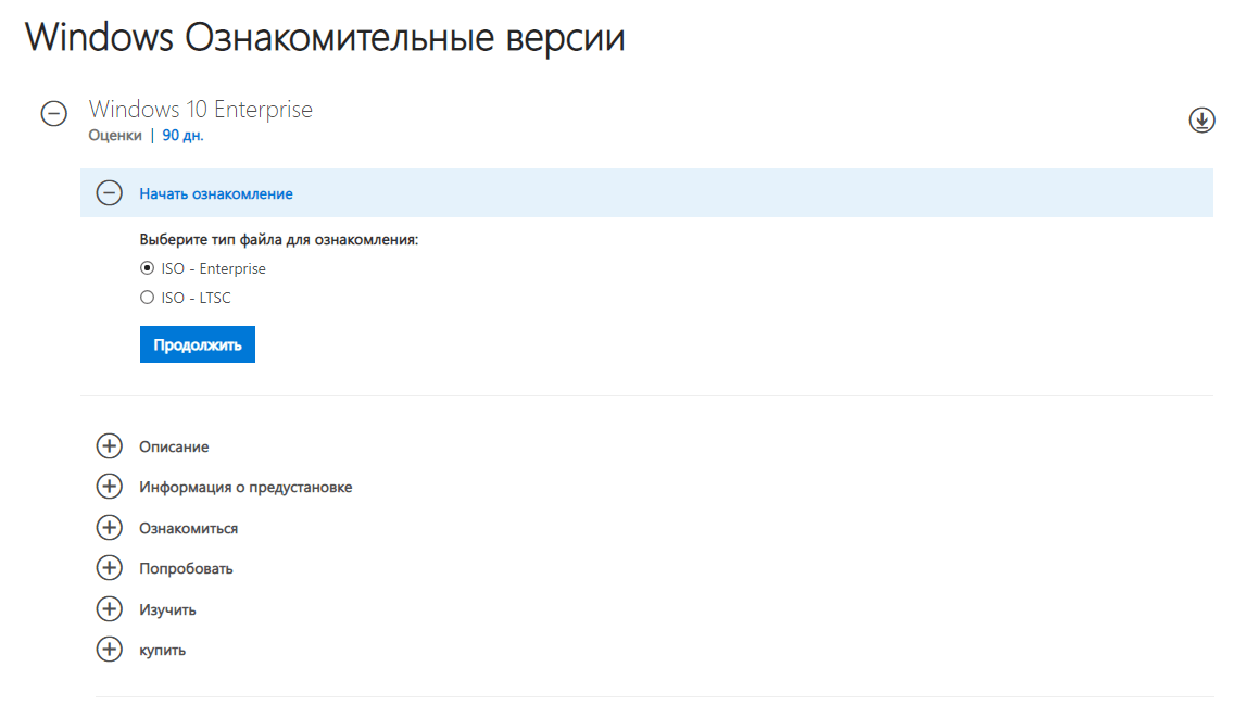 Win10 LTSC доступна для загрузки на сайте Evaluation Center — официальном ресурсе Microsoft, где выложено всё бесплатное оценочное ПО — по адресу: