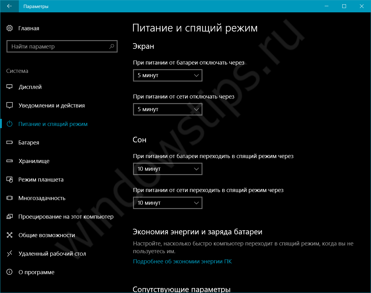 Рассмотрим основные настройки и опции спящего режима – Параметры Windows и настройки электропитания.