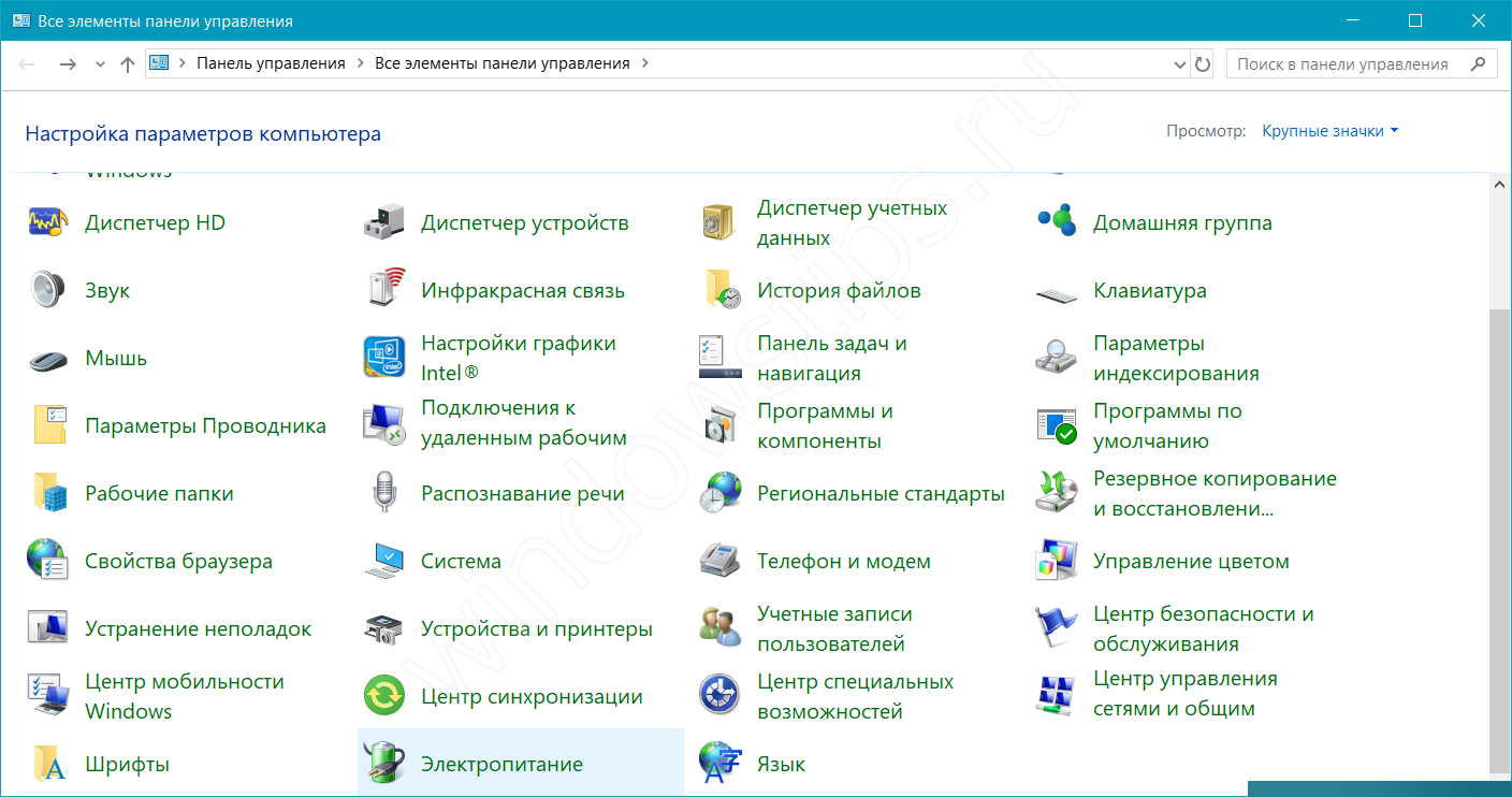 - переведите просмотр на «Мелкие значки» и зайдите в раздел «Электропитание»;
