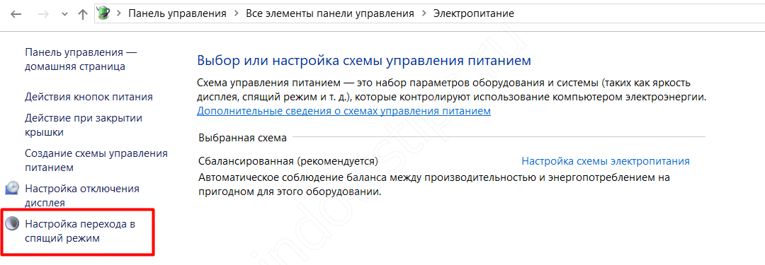 - слева найдите пункт «Настройка перехода в спящий режим» и выберите нужные параметры.