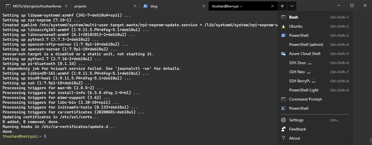 Figure 3. Windows Terminal with SSH profiles to common endpoints.