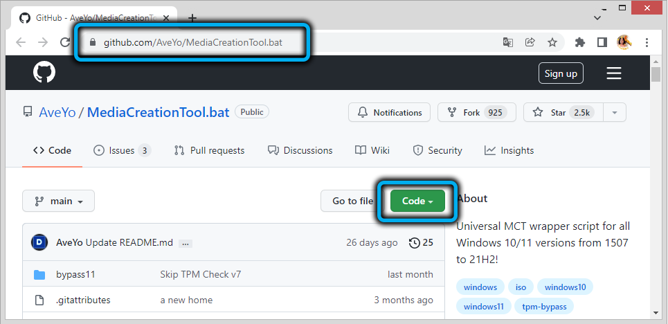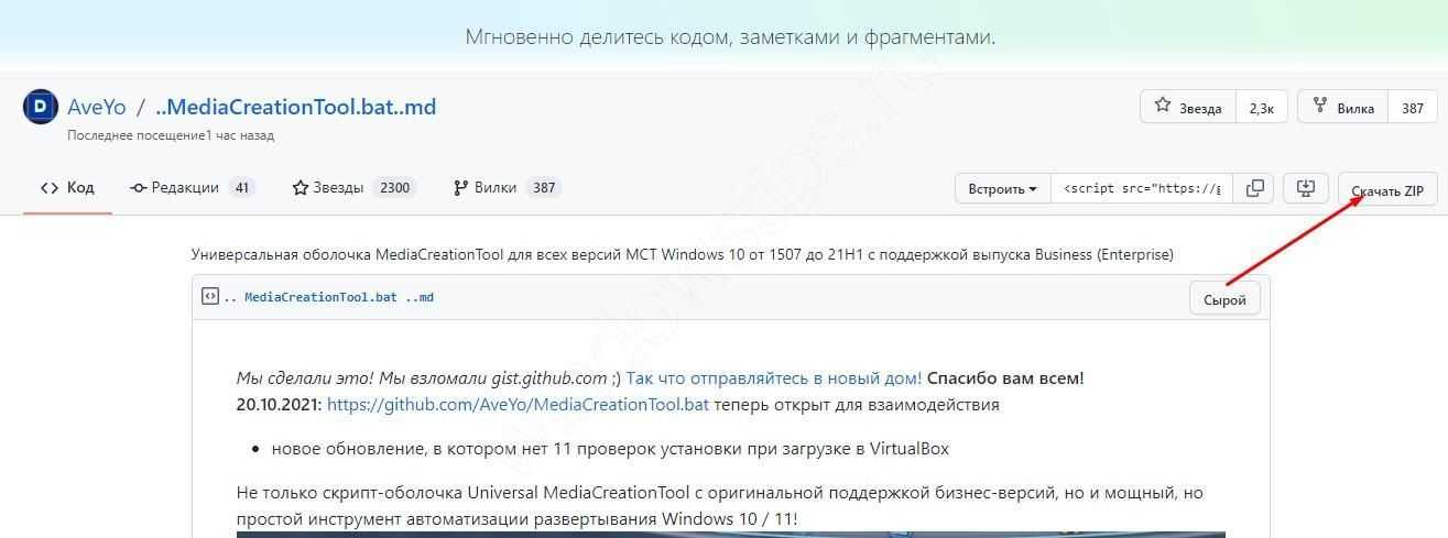 Для обновления операционной системы данным способом, нужно скачать Universal Media Creation Tool. С его помощью мы сможем выполнить обновление до Windows 11 без проверки на совместимость компьютера. Чтобы скачать Universal Media Creation Tool, перейдите на его страницу на GitHub. Нажмите кнопку «Code» и выберите «Download ZIP».