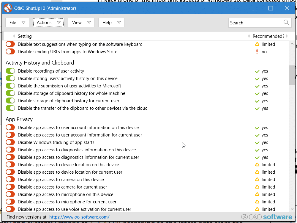 The tool also allows you apply all recommend settings or apply all recommended and limited recommended settings, which is helpful if you are not sure what all to disable.